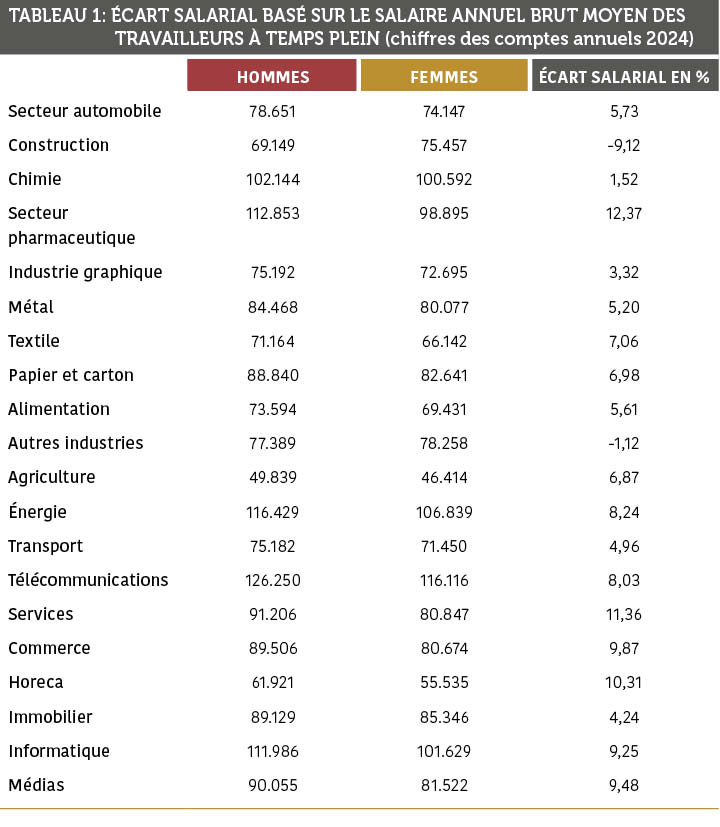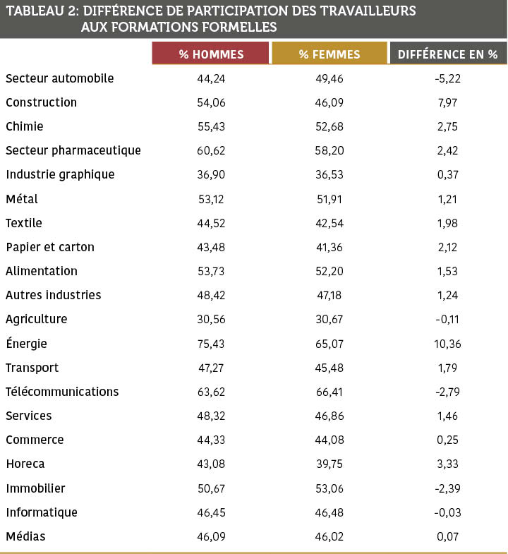 Une autre partie de l’explication concerne l’accès aux formations. Les personnes qui se forment davantage acquièrent de l’expertise, évoluent plus rapidement et accèdent plus vite à des fonctions mieux rémunérées. Il convient donc de se demander si les femmes disposent des mêmes possibilités de formation que les hommes. Cette information peut également être consultée dans le bilan social de votre entreprise. L’employeur a en effet l’obligation de fournir des informations, ventilées en fonction du genre, du nombre (d’heures) de formations suivies et du montant consacré à celles-ci. Nous avons calculé pour chaque secteur le pourcentage d’hommes et de femmes qui ont suivi une formation formelle en 2024. Les résultats figurent dans le tableau 2.