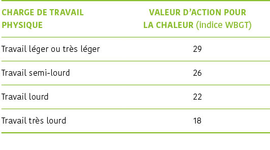 L’employeur doit, au préalable, sur la base d’une analyse des risques, déterminer à quels endroits de l’entreprise les valeurs d’action d’exposition à la chaleur pourraient être dépassées (cf. encadré).