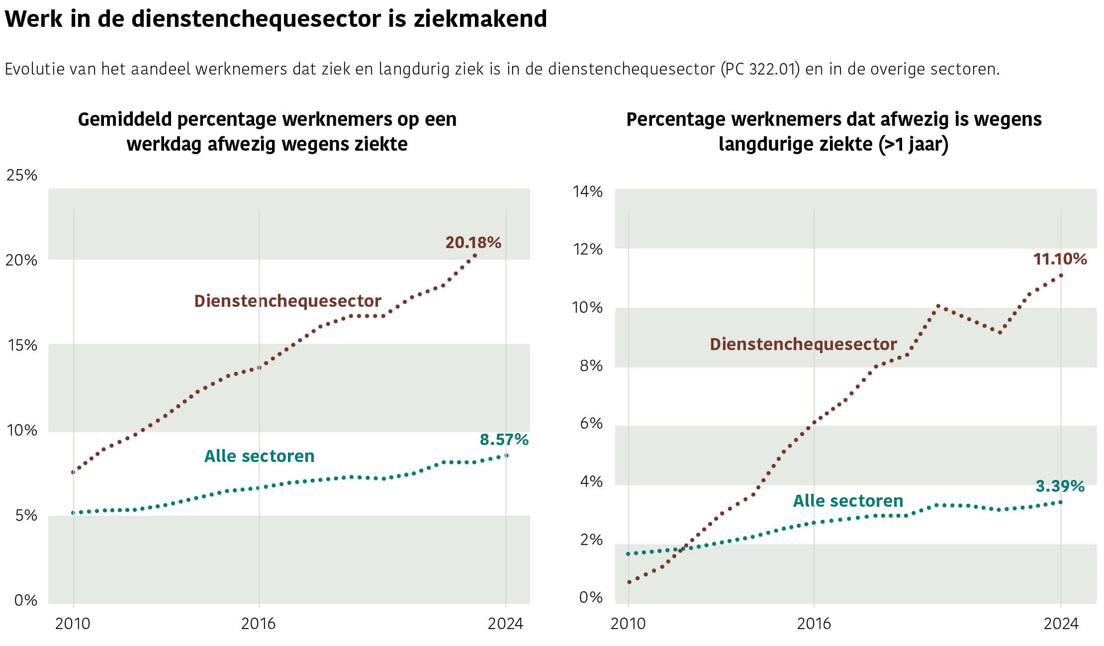 De 140.000 huishoudhulpen in de dienstenchequesector vormen een grote, vaak precaire groep werknemers die structureel ziekmakend werk moet uitvoeren. Het gevolg is een enorm hoog en stijgend aandeel onder hen dat kort of langdurig ziek uitvalt.